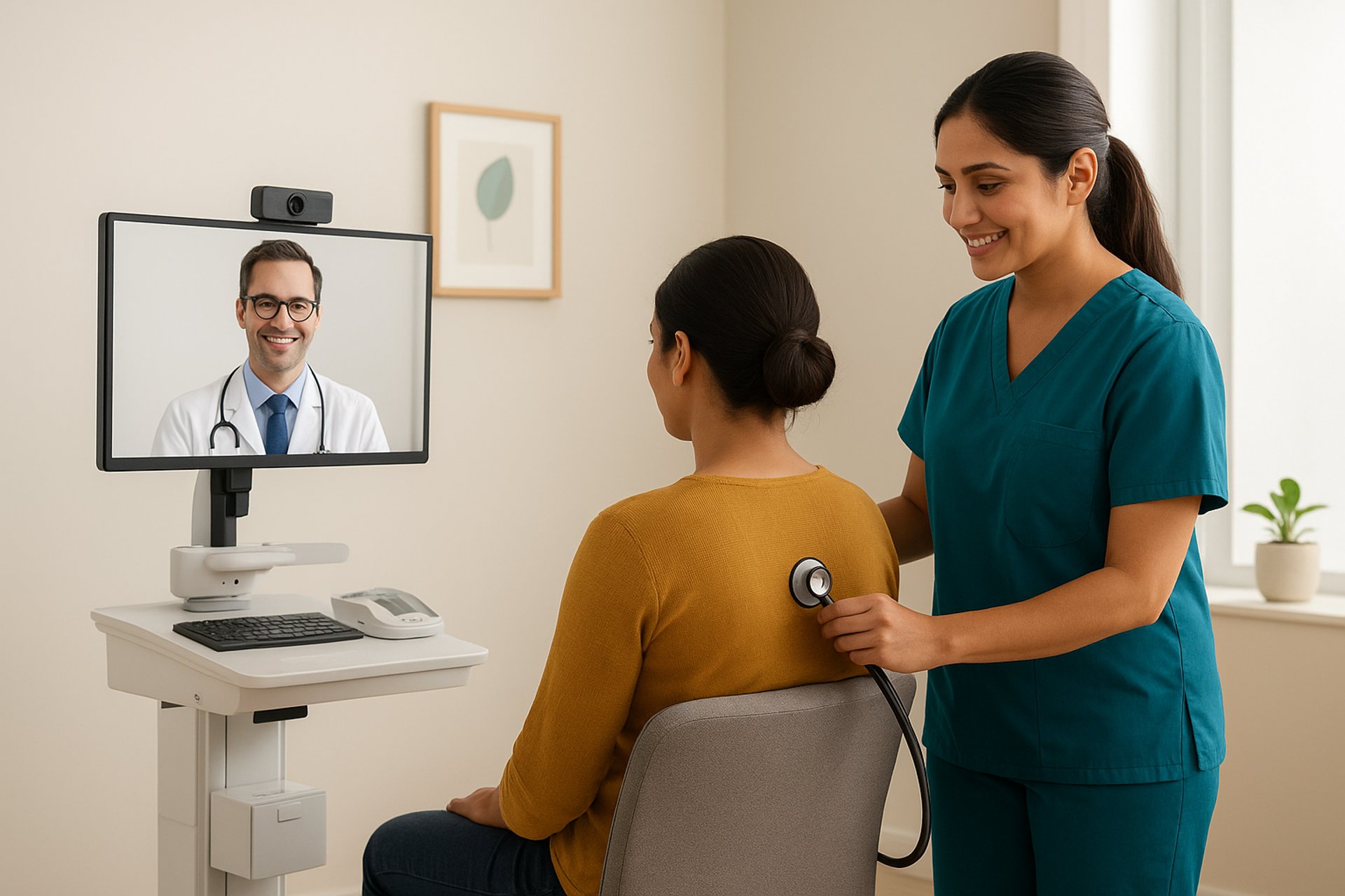 Remote doctor with onsite nurse and digital medical tools are integrated to virtual care and clinic management system delivers quality healthcare to corporate employees